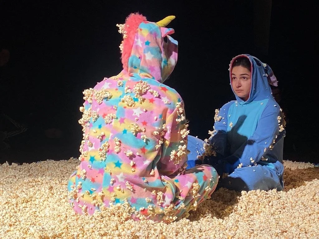 The show POP POP POP: Till You Stop!, explores the relationship, similarity and contrast between the external stimuli and the inner turmoil of our unknown longing. The piece asks the hard hitting questions of: What happens when monotony becomes intriguing? How many kernels does it take to fill a room? And, how long can you stay with your own mind?